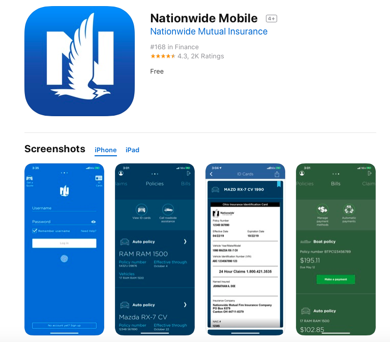 Nationwide’s mobile app is available on Android,iPhone® and iPad®. Through the app, you can make payments, manage your payment methods, file a claim, save ID cards, get claims status info, request roadside assistance, and more.