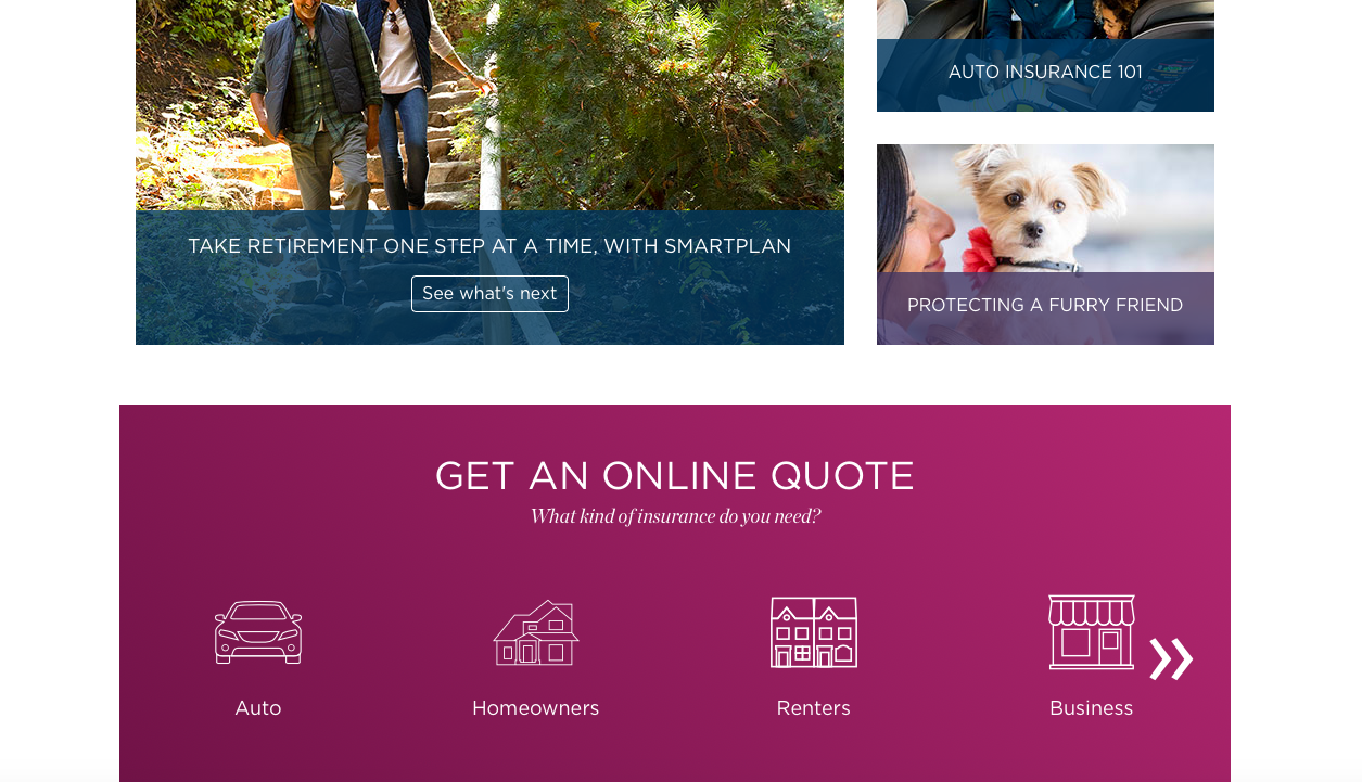 Scroll further down and you’ll see the above, where you can learn more about retirement, auto insurance basics, and start an online quote.