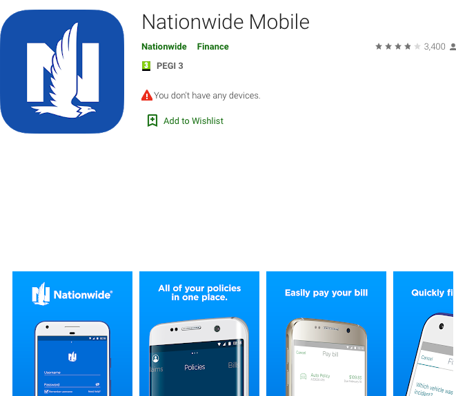 The App Store version has a 4.3-star rating based on approximately 2,000 ratings, while the Google Play Store has 3,400 reviews for a 4.0-star rating at the time of this Nationwide auto insurance review.