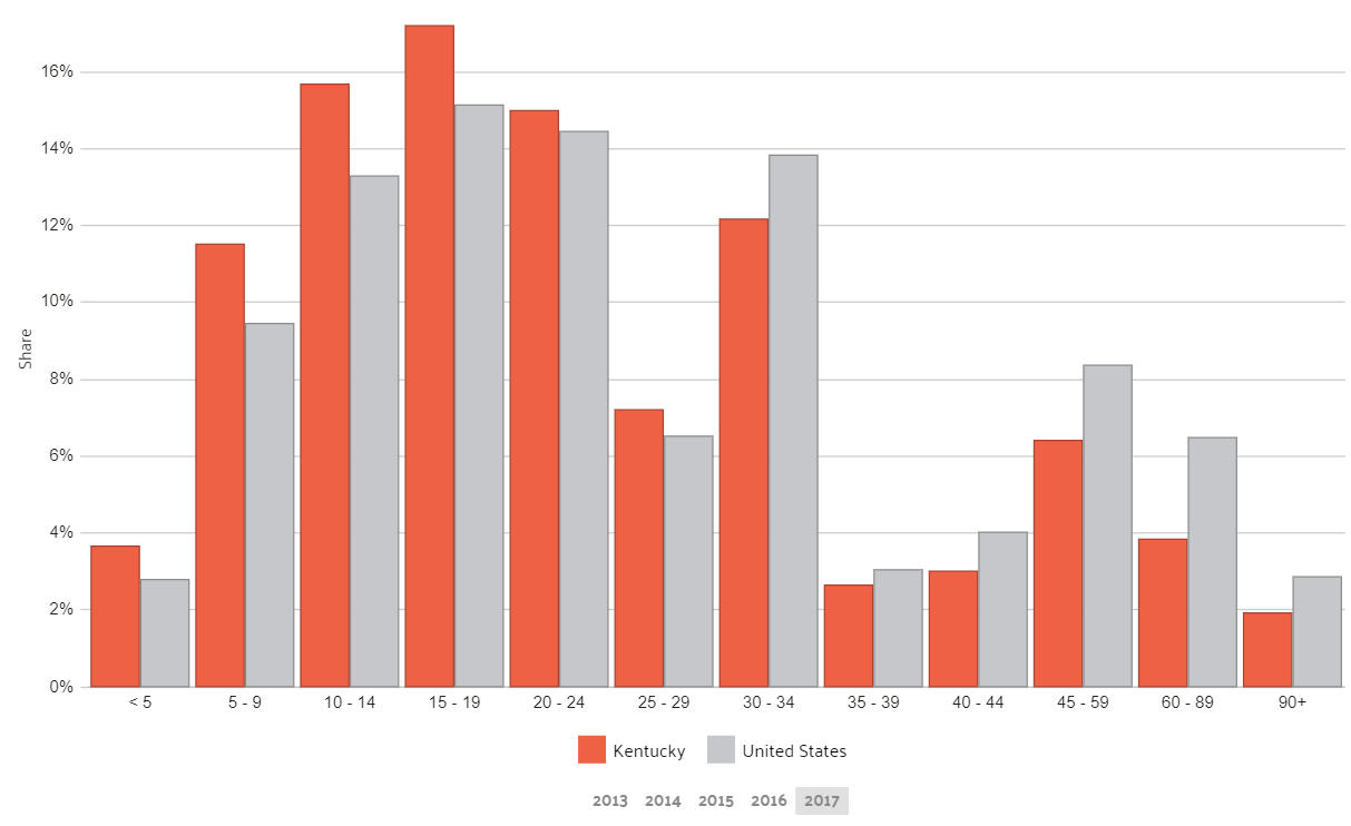 The under 21 fatality rate for alcohol-impaired driving per 100,000 population is 0.9 in Kentucky while the national average is 1.2.