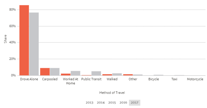 Even though your commute could range anywhere within Mississippi’s state average, it’s good to know how your neighbors are getting to work. The vast majority of the workforce in Mississippi – 84.6 percent – forgoes carpooling in favor of driving on their own.