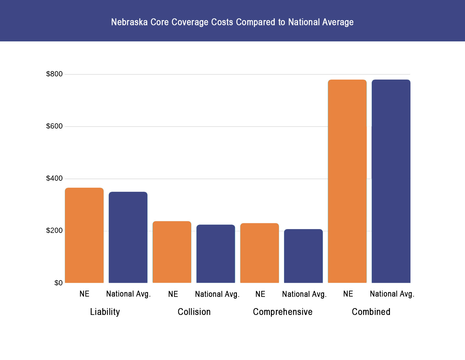The core group of auto insurance coverage in Nebraska includes liability, collision, and comprehensive. Combined, these form the full coverage policy. The table below shows NAIC data for the average annual cost of each of these forms of coverage based on Nebraska’s state minimum.