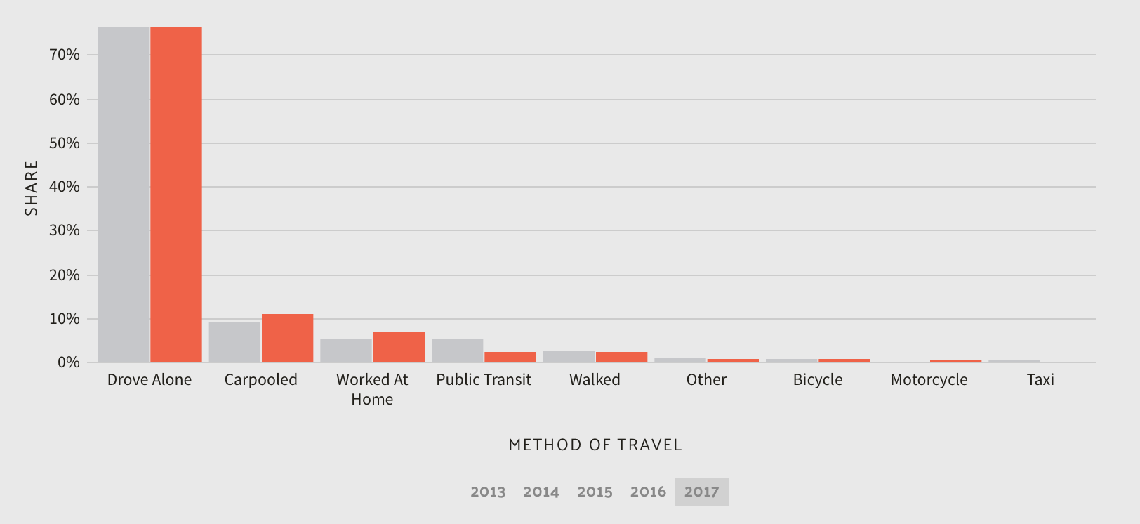 In 2017, the most common method of travel for workers in Utah was Drove Alone, followed by those who Carpooled and those who Worked At Home.