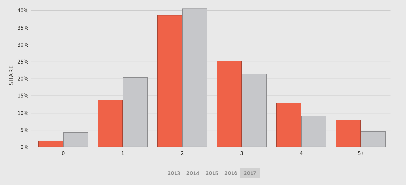 According to Data USA, the following chart displays the households in Utah distributed between a series of car ownership buckets compared to the national averages for each bucket.