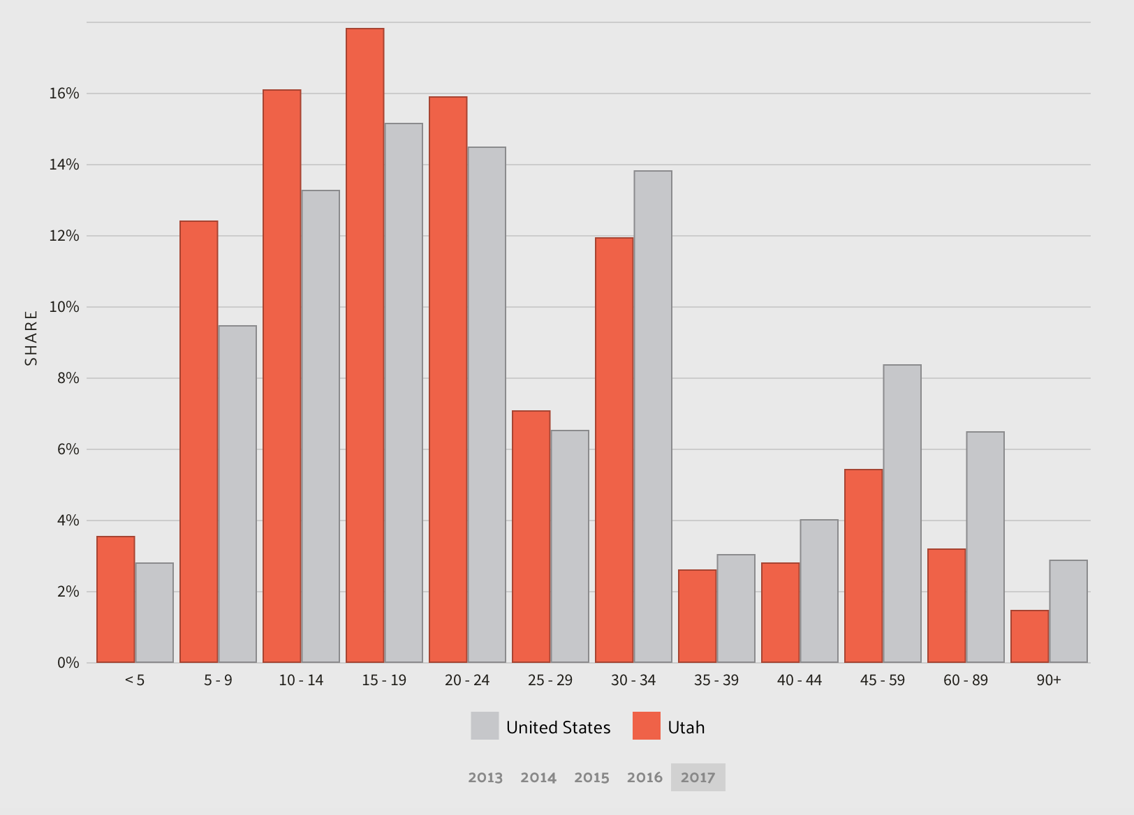 The orange bars shown above represent Utah’s average and the gray bars represent the national average.