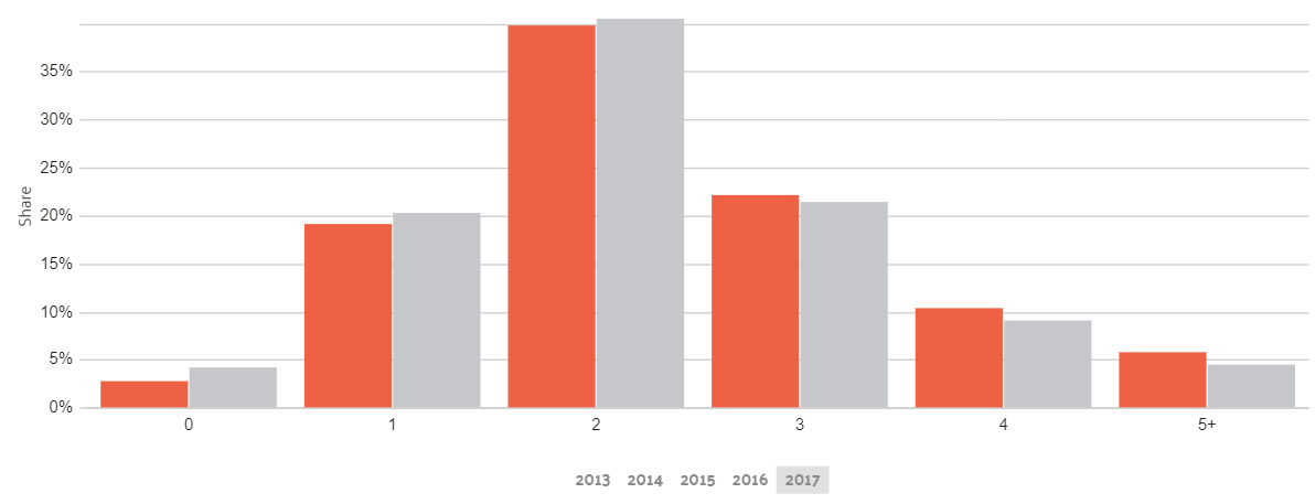 The chart, illustrated by Data USA, shows the percentage of households with the number of cars they own in Washington vs the national average (in grey). Most of the households in Washington own two cars, followed by three cars.