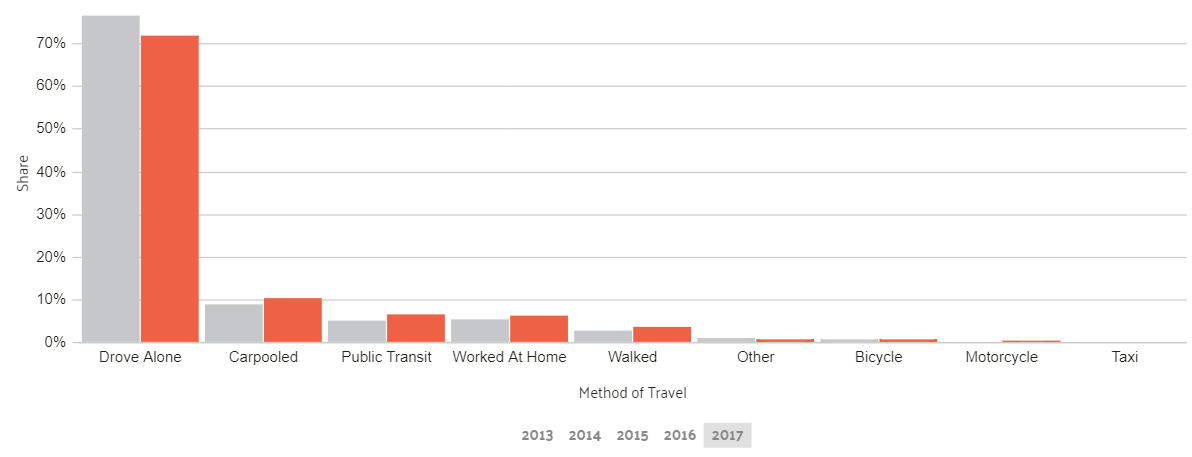 The most common way for commuting is driving alone in Washington and only 10.2 percent of the people carpool.