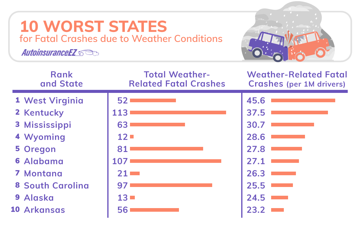 - In most of the worst states, rain is the main cause of fatal weather-related crashes.